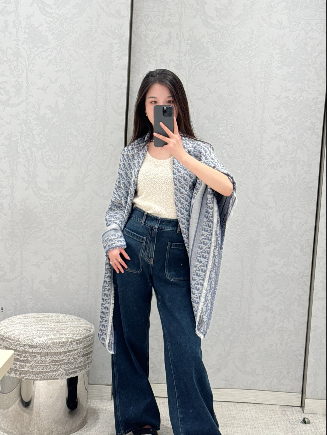 디올 데님 버건디 울 실크 숄