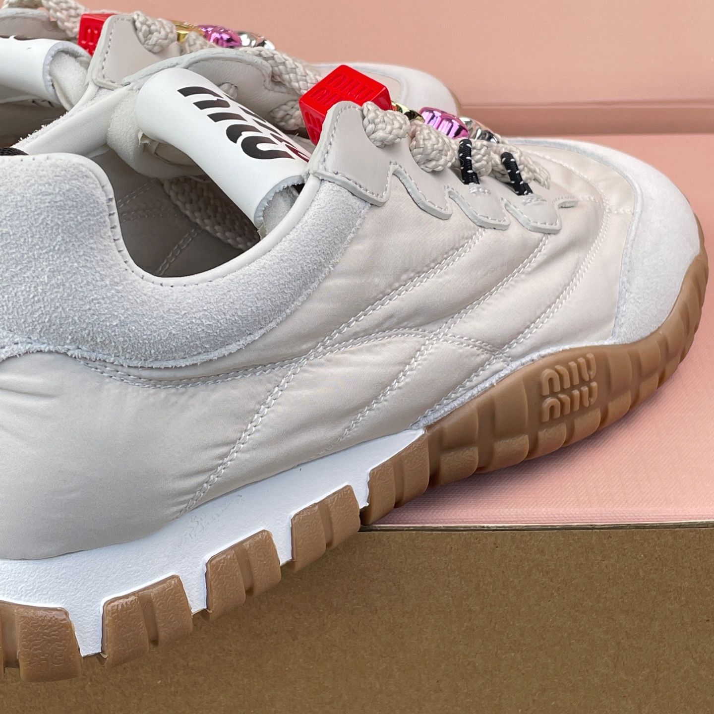 미우 미우 타이어 테크니컬 패브릭 앤 스웨이드 스니커즈 아이보리