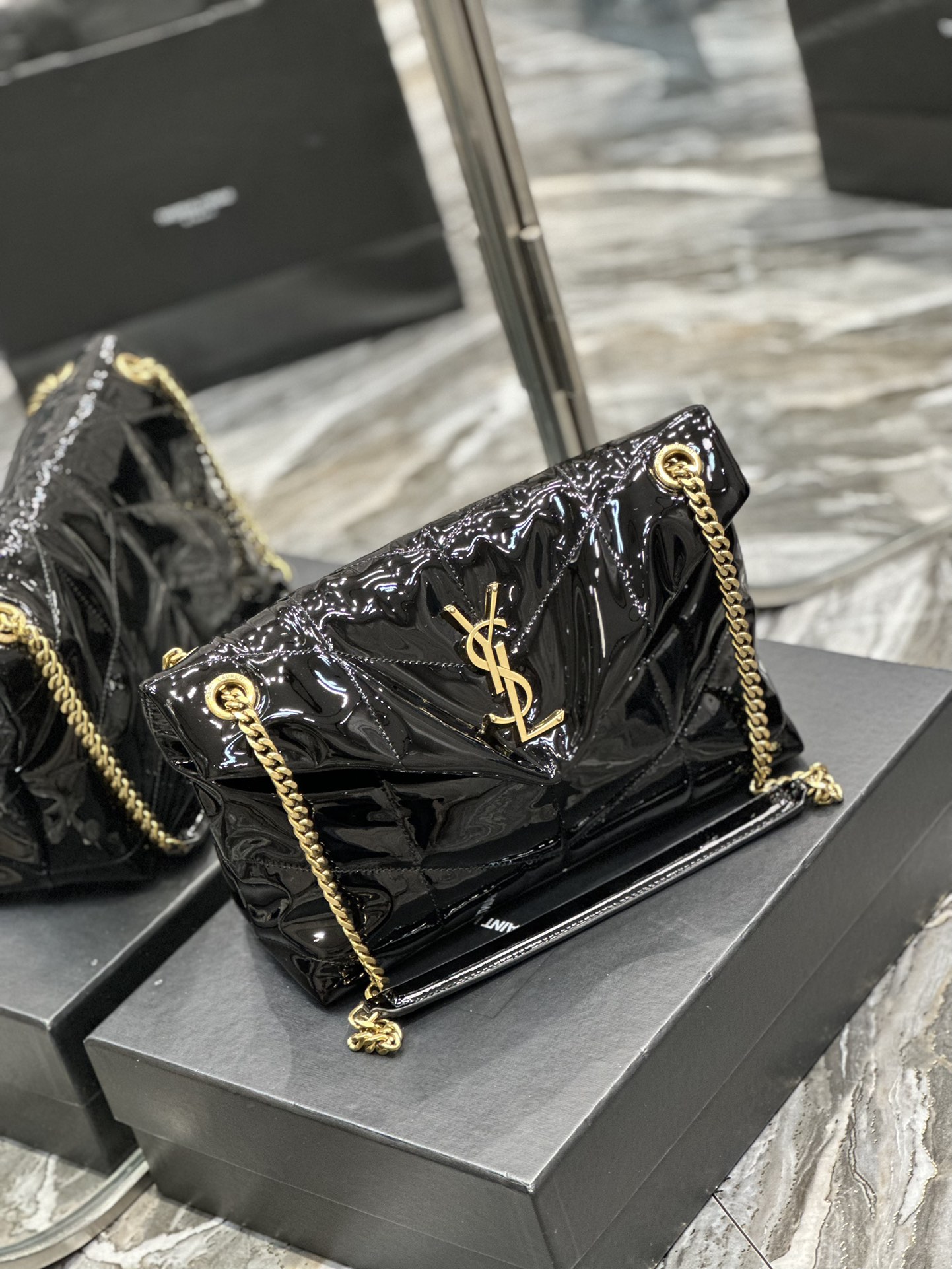생로랑 모노그램 PUFFER 샤이니 레더 숄더백 블랙 골드